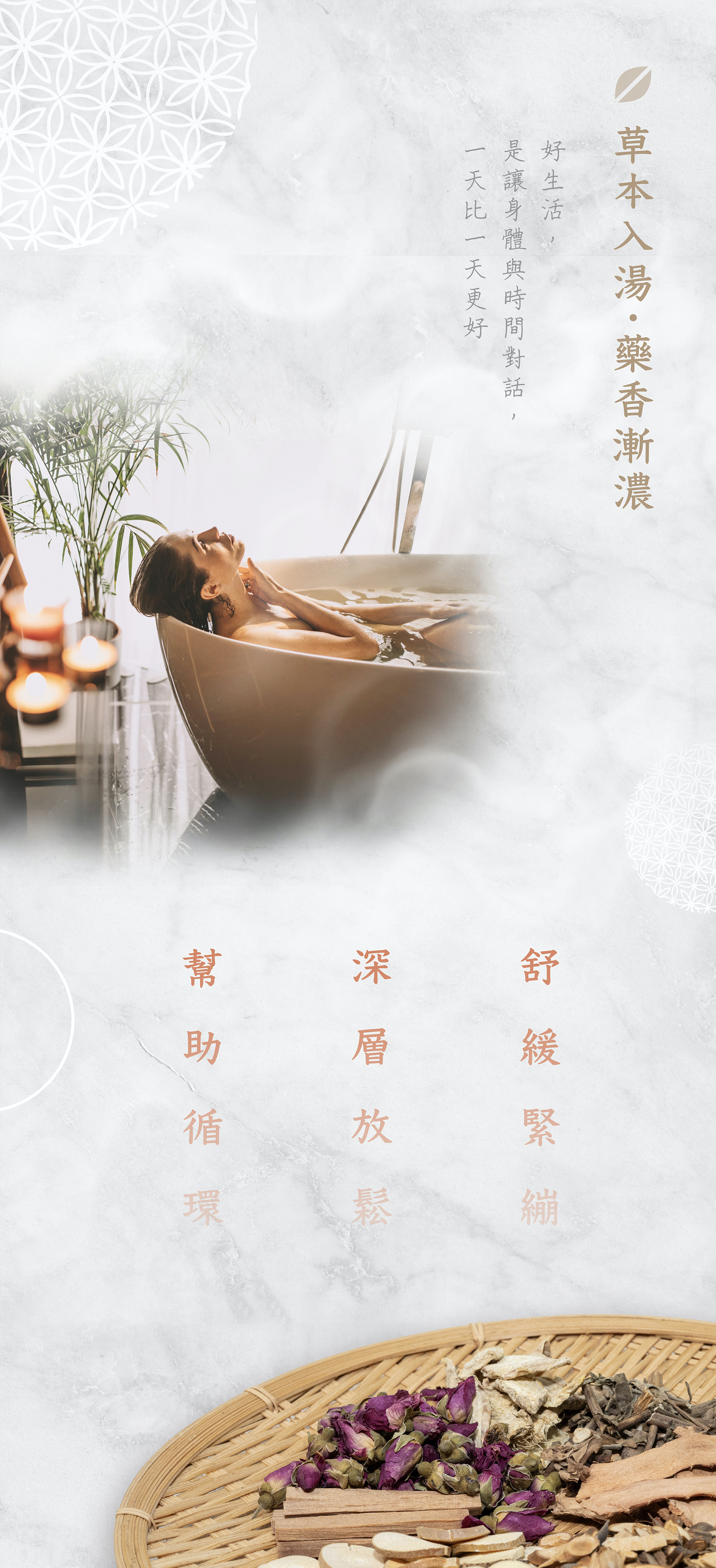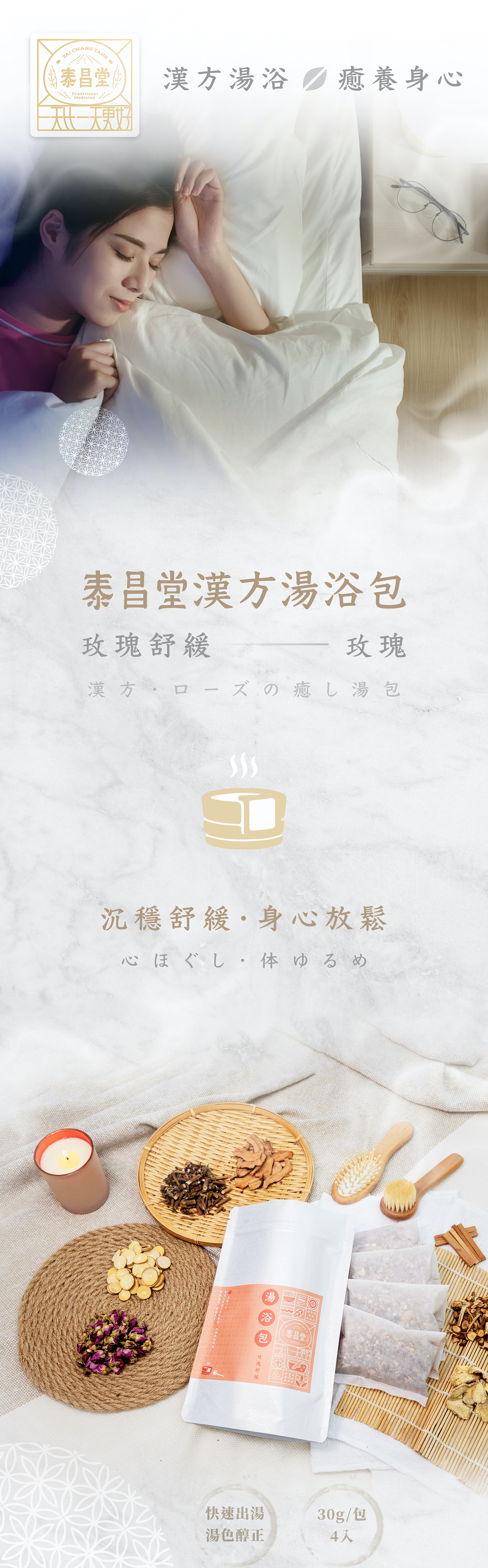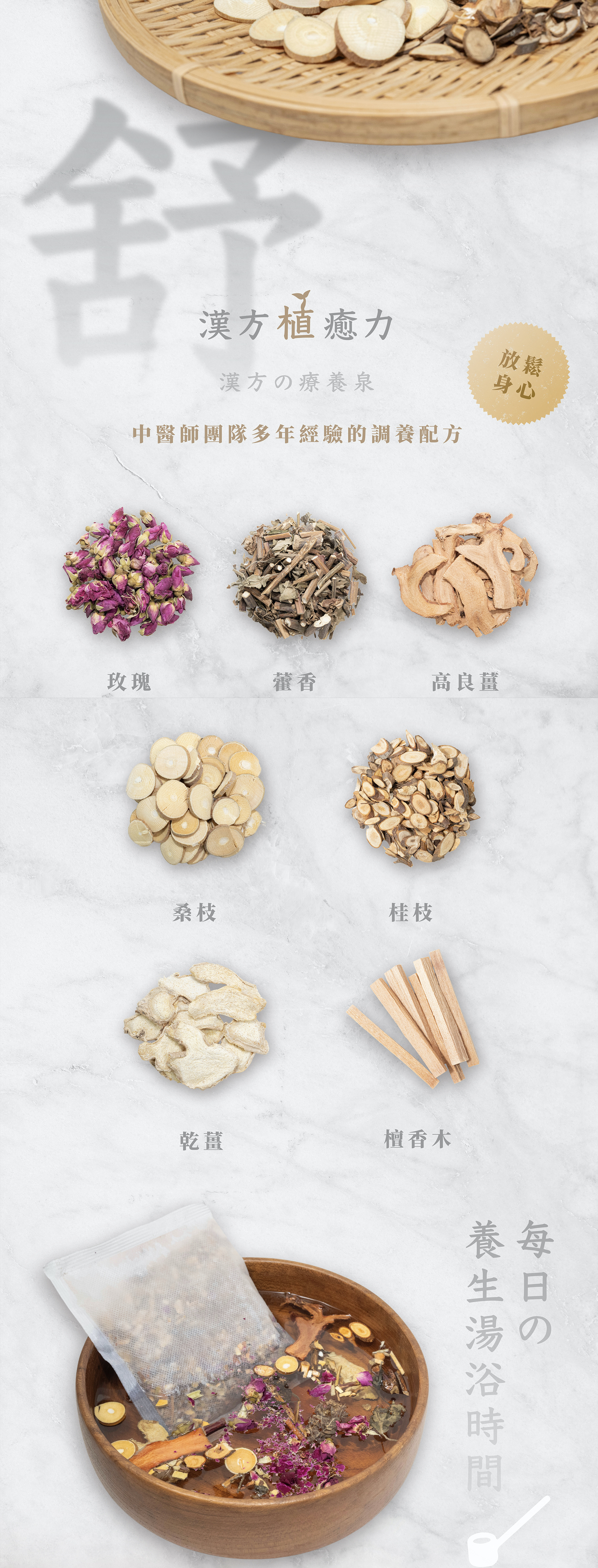 嚴選玫瑰、藿香,帶來芳香感受,每一縷蒸氣,放鬆撫慰您的肌膚與身心。湯色由紫紅漸變為褐,桂枝、桑枝、乾薑溫熱感受幫助放鬆、舒緩疲勞,如沐山林、馥郁滋養。